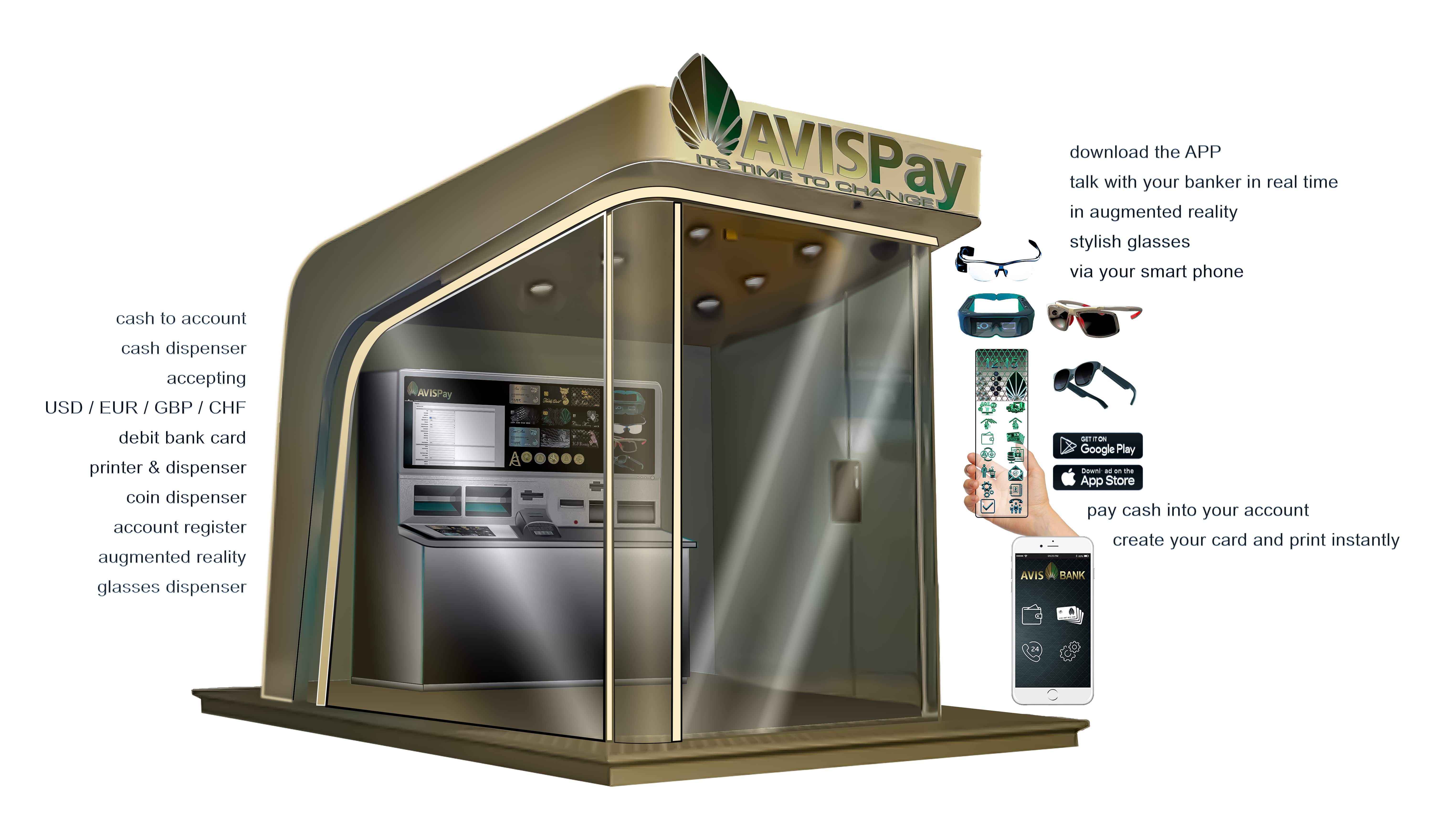 Shortly, AVIS Bank, with its unique technology system, intends to provide worldwide a fully automated Bank Kiosk for your daily needs where a bank needs to be involved. Here you get your personalized card on the spot. You select a stylish augmented glass and make your bank business with a bank officer from wherever you are.