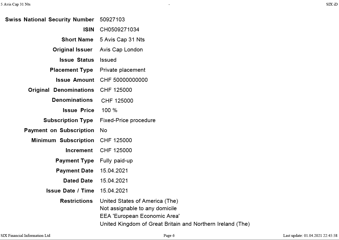 The AVIS Cap-Notes 5%-2023-26 are considered as a save harbour money market product of the AVIS Group and its AVIS Bank. The AVIS bank product is a fixed term Swiss Francs denominated green note with a 3-year maturity (the “Note”).