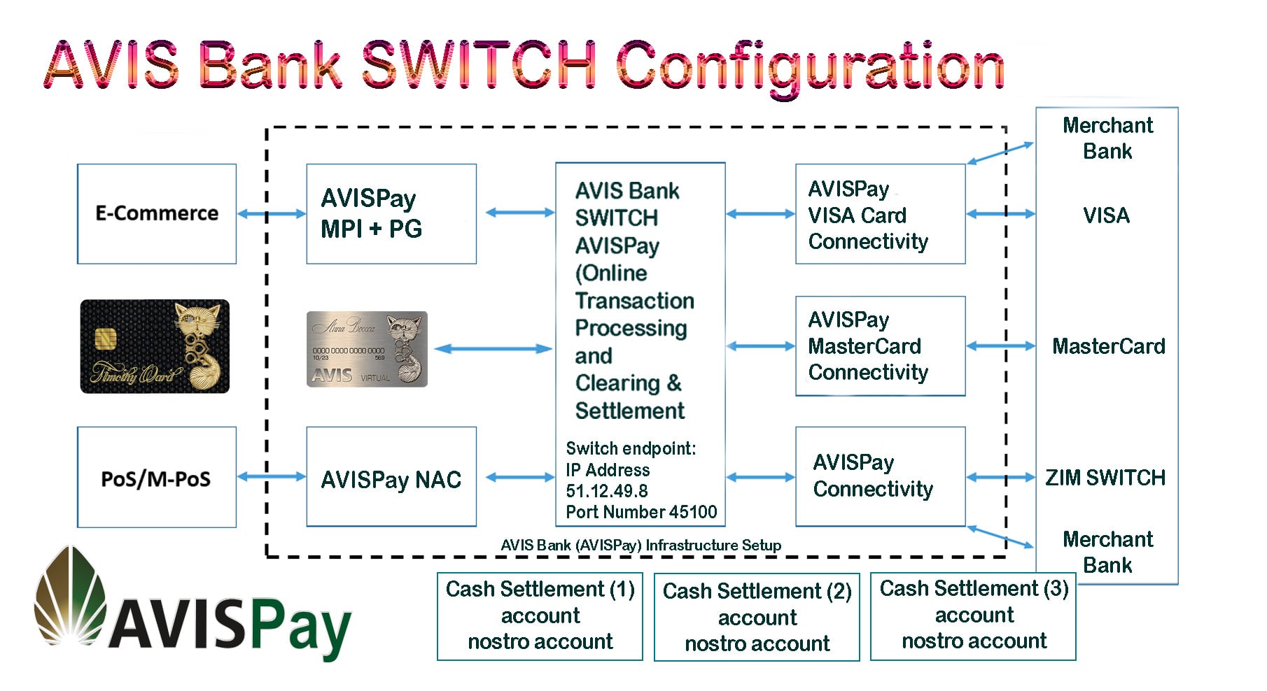 The ultimate solution is the AVIS Banks SWITCH technology, functional for debiting bank accounts worldwide by card processing, which has been the kick-off for the creation of a payment server, whereby the sender bank and the receiver bank are connected directly by IP to IP or API permanent connection.