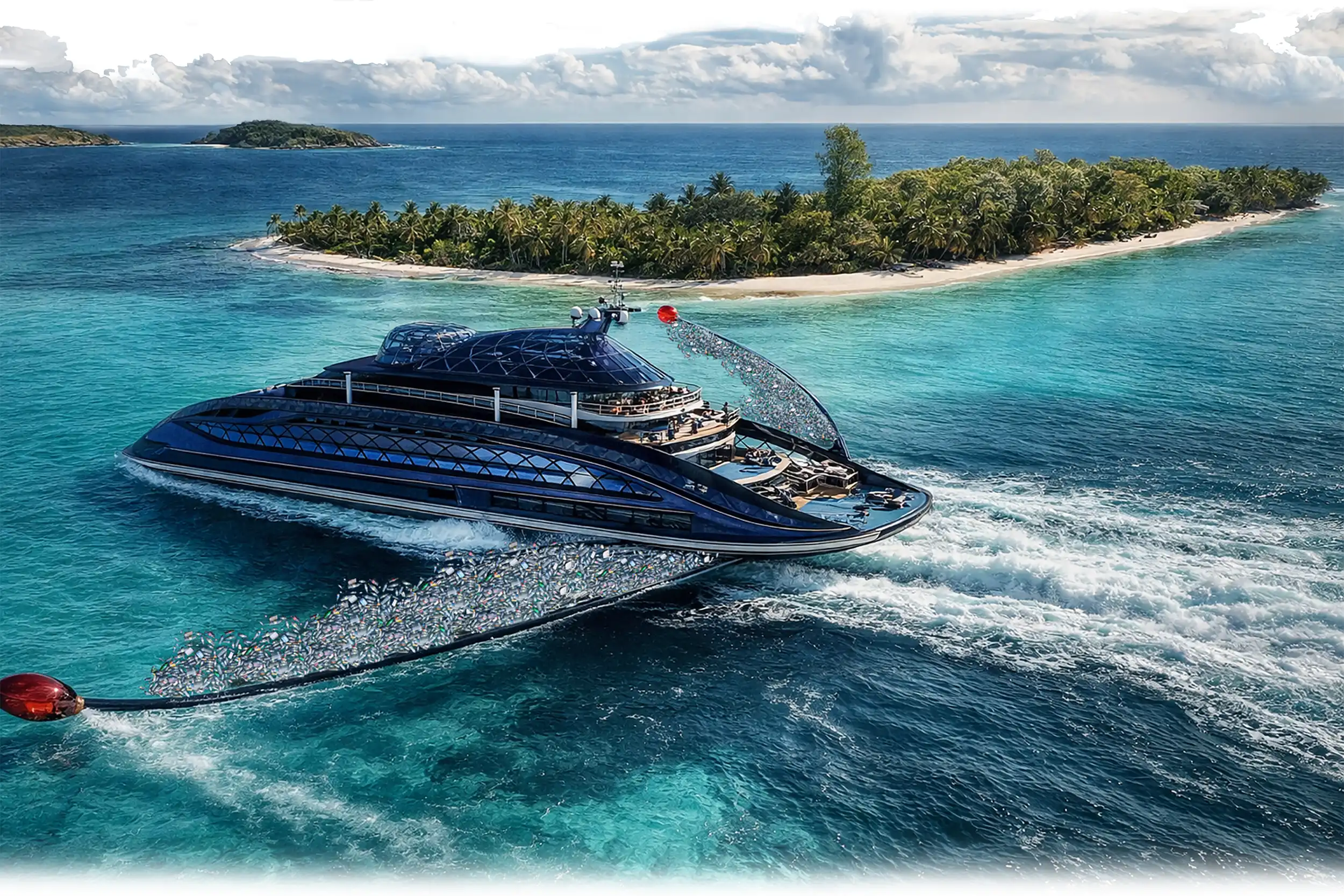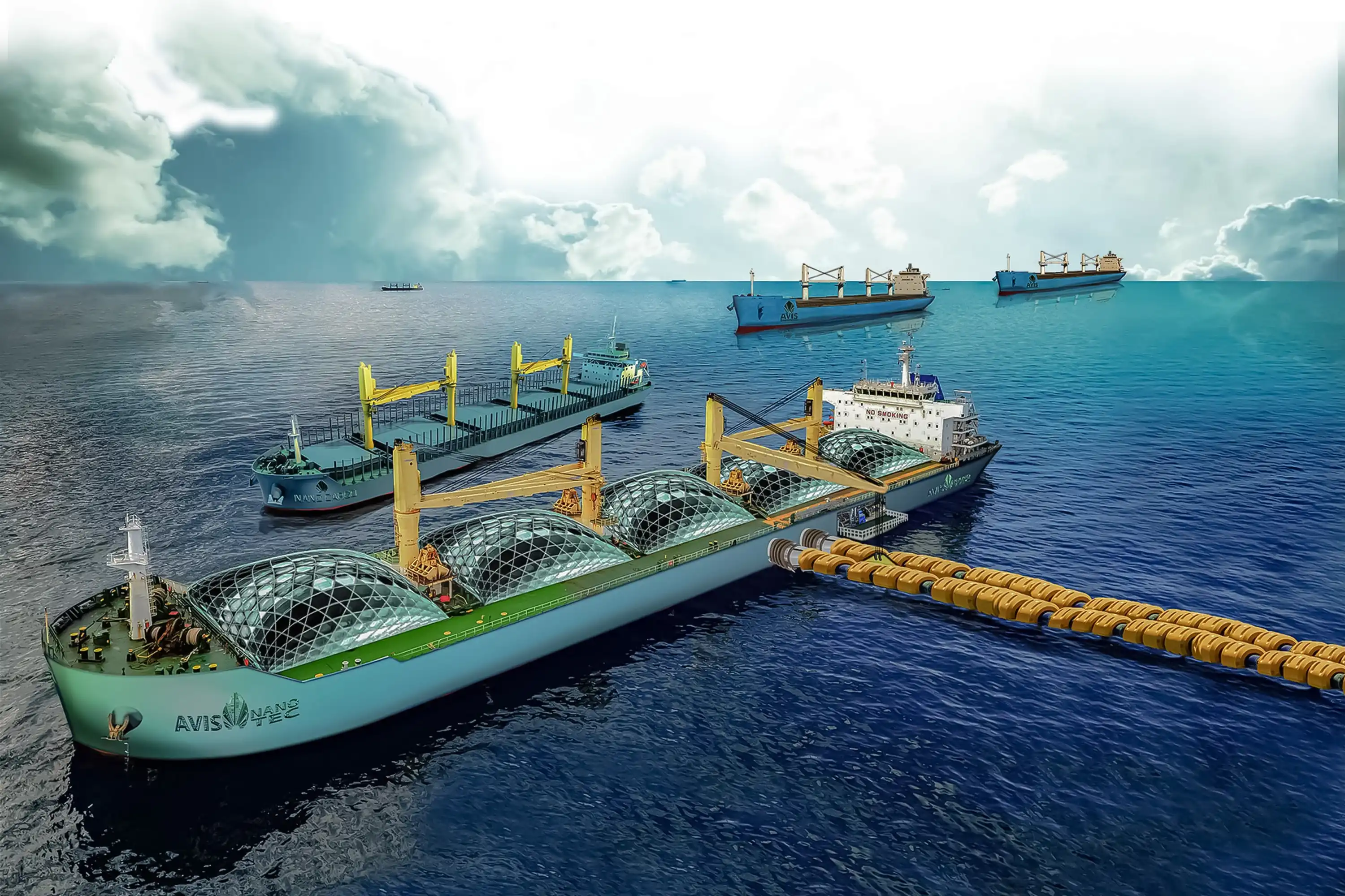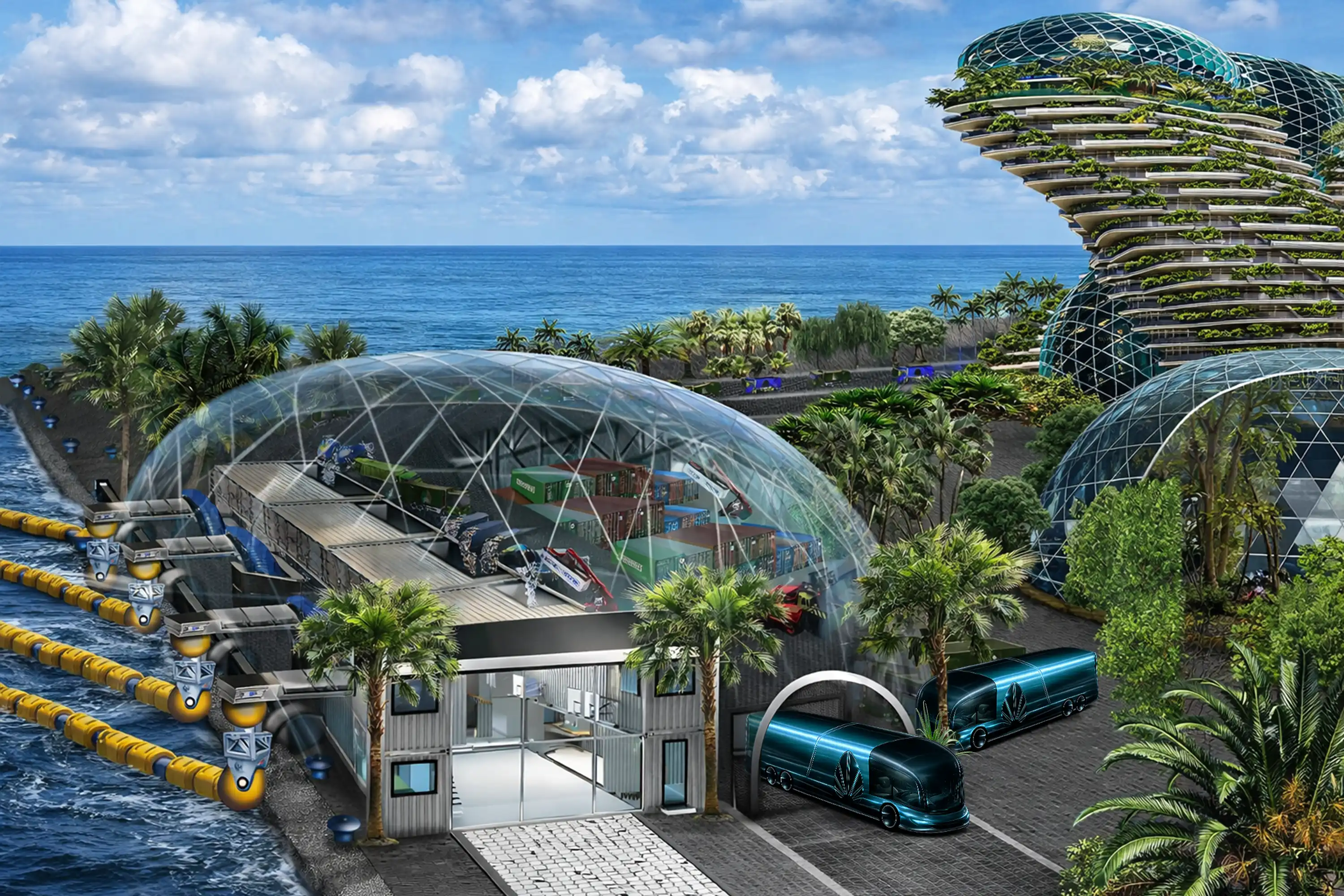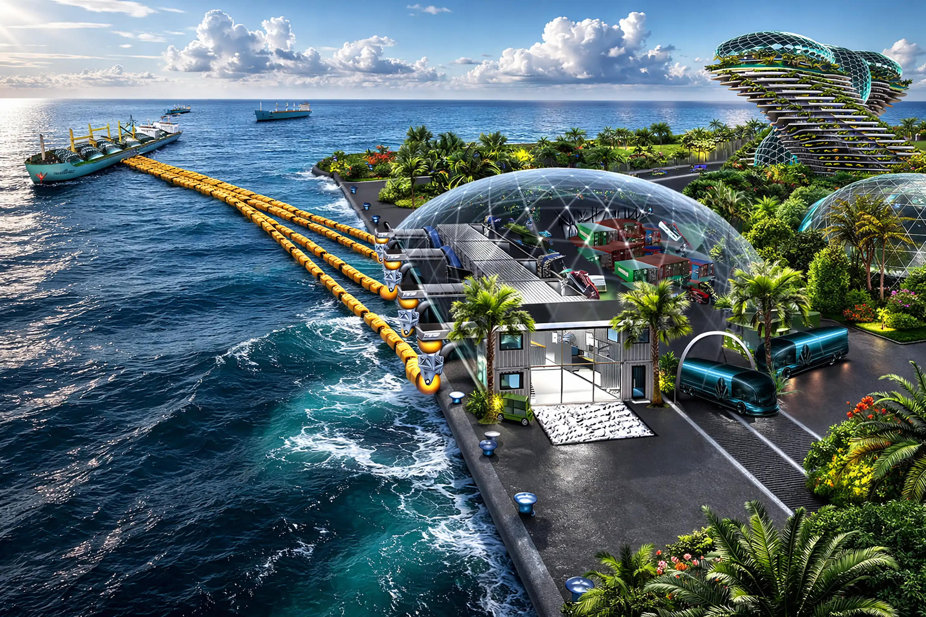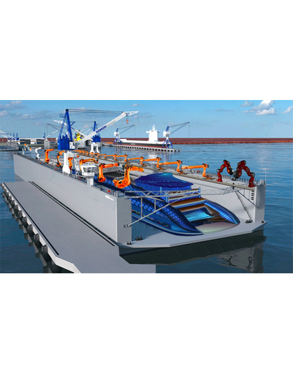 Within 72 hours, fully functional. The container-based loading dock sends unsorted or pre-sorted waste by the tubes to the vessel for shredding and milling to nano powder. The dock will be covered by a solar glass dome with negative air presser to prevent external smells and air pollution. The intention will be processing up to 10.000MT every day. If in case the processing vessel is not able for docking directly at the harbour, the feeding tubes will connect the loading station directly with the vessel up to 1000meters.