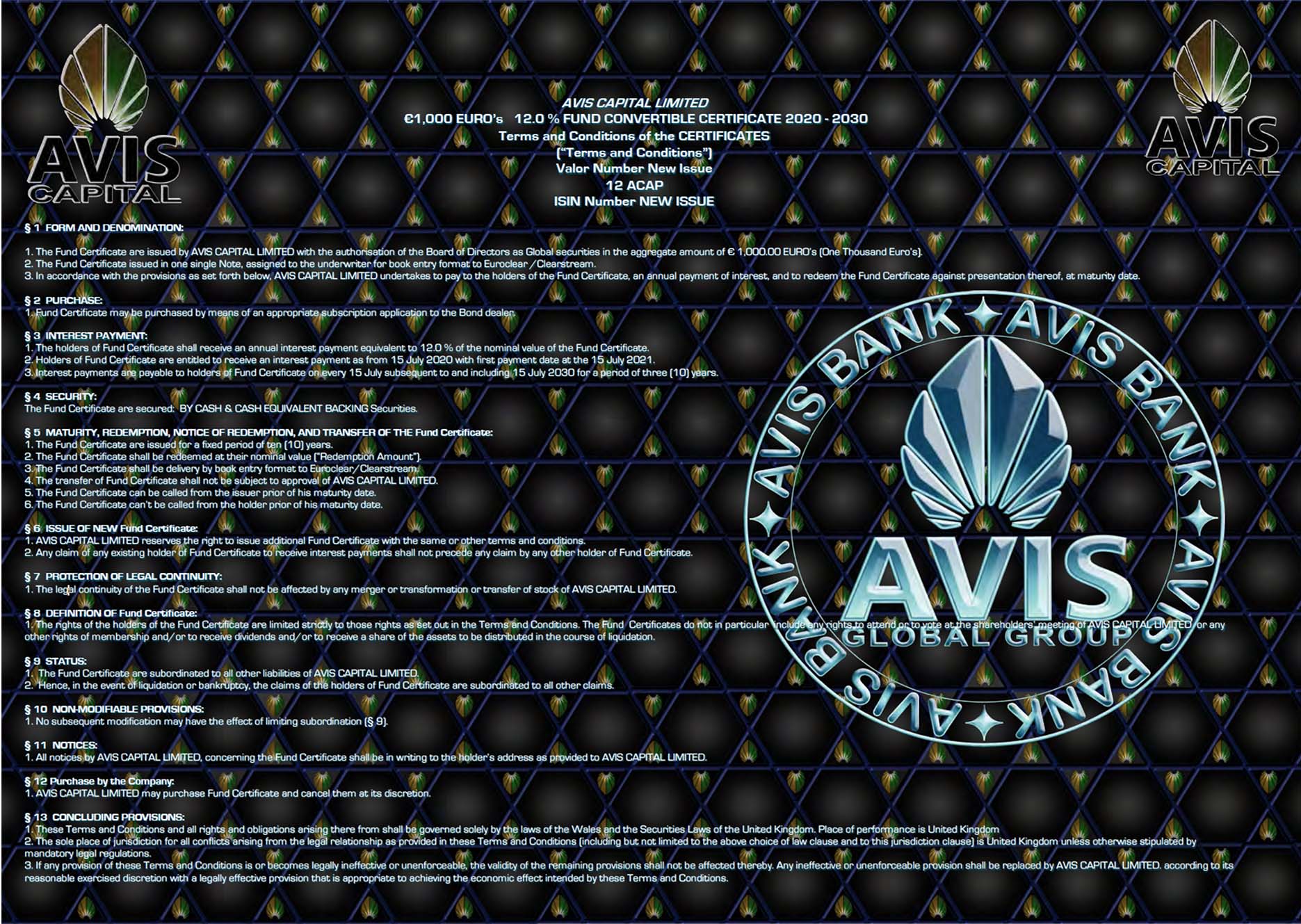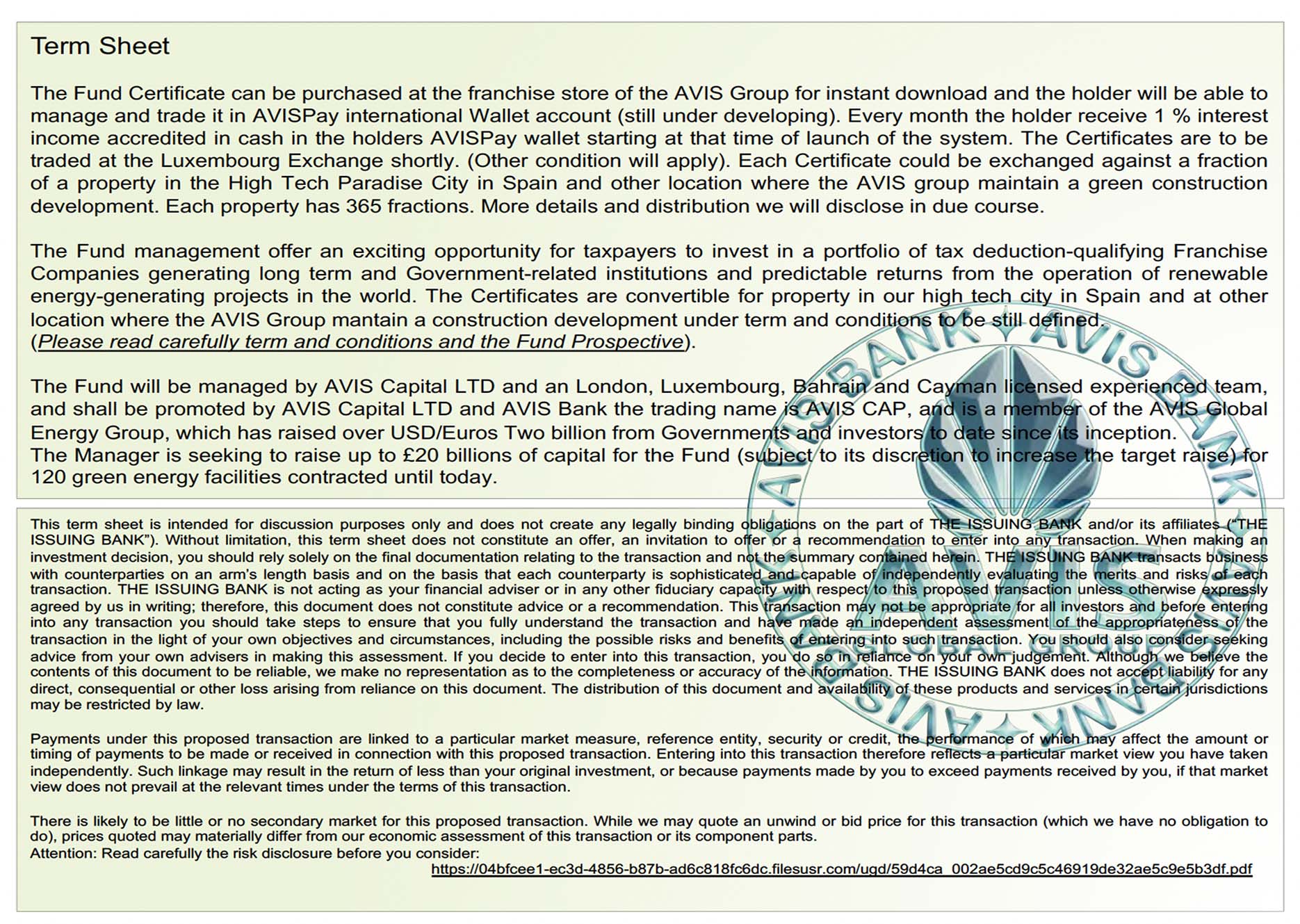 The Fund is managed by AVIS Capital LTD and shall be promoted by AVIS Broker Dealers Syndicate and AVIS Bank Limited. The trading name is AVIS Global Energy and is a part of the AVIS Global Group, which has raised over USD/Euros Forty billion from Governments and investors to date since its inception.